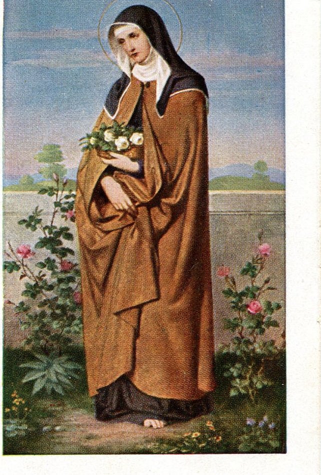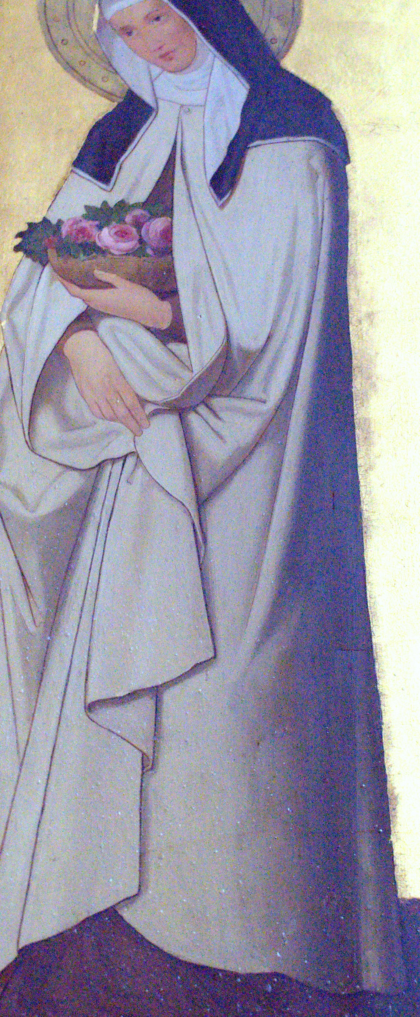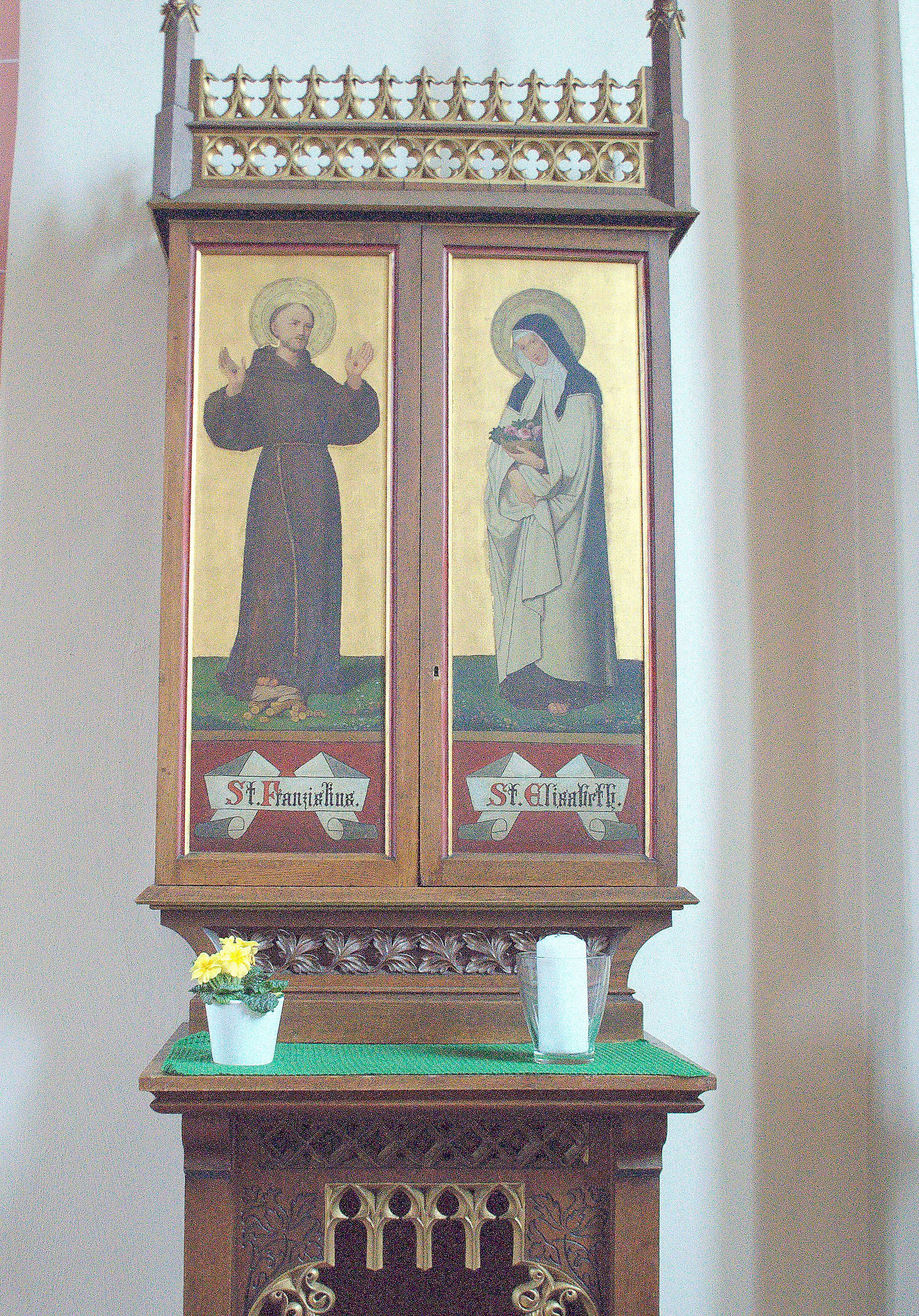 Sie zeigen zwei Heilige, die durch Inschrift identifizierbar sind. Rechts ist jene abgebildet, dessen Kleid im Retabel eingeschlossen ist: Die Hl. Elisabeth. Sie trägt den Habit der Franziskanerinnen, einen schwarzen Schleier, weißen Umhang und braunes Untergewand. In den Händen hält sie einen Korb voller Rosen, der ein Hinweis auf das Rosenwunder der Hl. Elisabeth ist. Es erscheint logisch, dass sie so auf dem Flügel dargestellt ist, denn die darin befindliche Reliquie galt lange Zeit als ihr Bußgewand, weshalb man dachte, dass es ihr Terziarinnen-Ordenskleid wäre. Deshalb wird sie auch im Ordenskleid der Franziskaner dargestellt. Wir wissen heute, dass es sich um ein einfaches Kleid der Heiligen handelt, das aber dennoch sehr aussagekräftig ist: Die Nüchternheit des Kleides ist eklatant.[7]