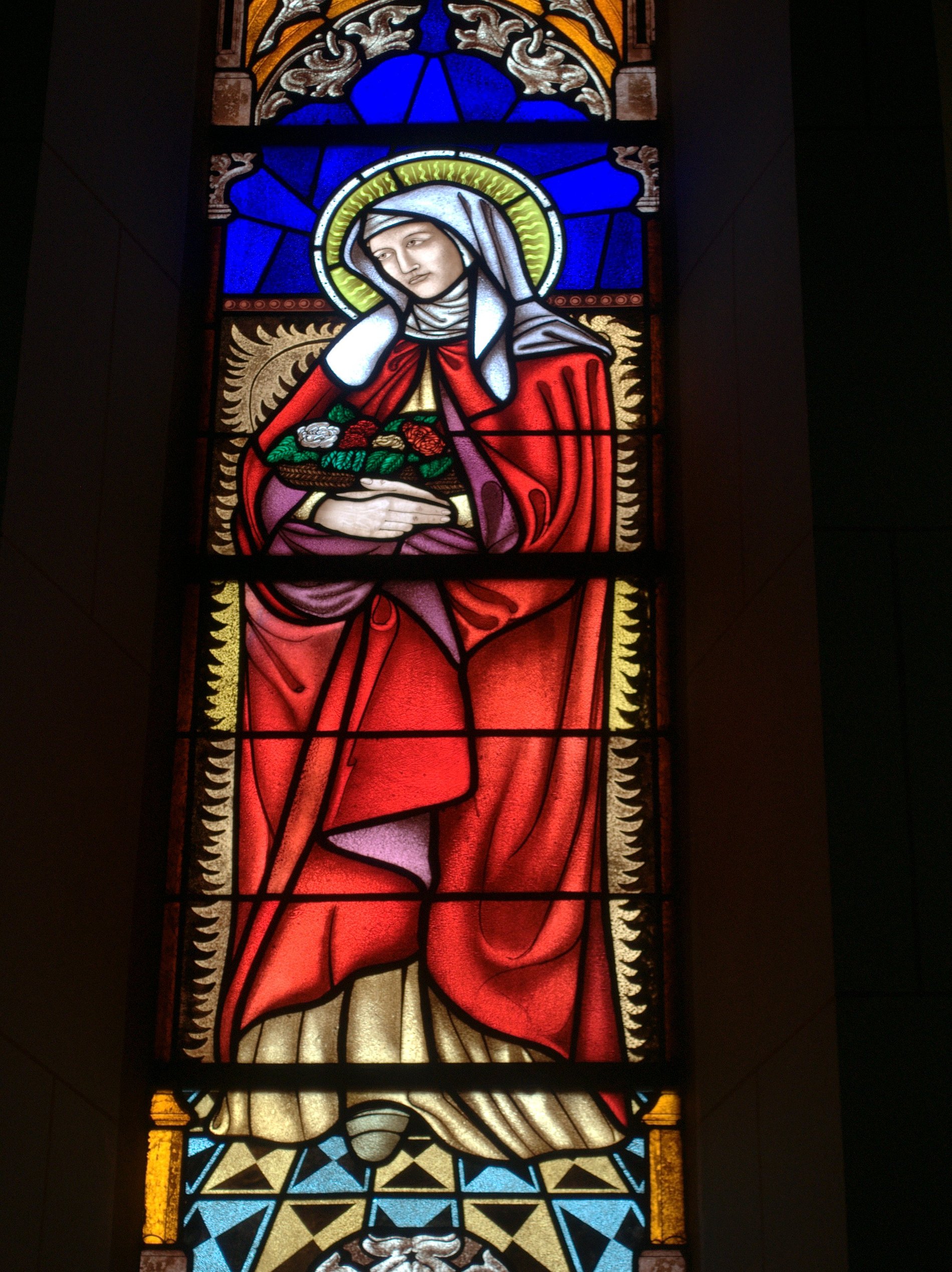 Das durch Andachtsbilder verbreitete Motiv der Hl. Elisabeth kann in vielen Kirchen entdeckt werden. Neben dem bisher besprochenen Altarbild in Oberwalluf gibt es die Hl. Elisabeth auch in der Glasmalerei. Als Fensterbild wurde die Hl. Elisabeth in der Form nach Franz Ittenbach bis weit ins 20. Jahrhundert dargestellt. In der katholischen Kirche von Saulheim hat Wolf D. Coelius aus Düsseldorf 1981 diese Hl. Elisabeth als Fensterbild gemalt.[12] Ebenso zeigt ein Kirchenfenster in St. Laurentius in Gundheim (1902) die Hl. Elisabeth, bekrönt und in einer Hand den Rosenkorb haltend.[13]