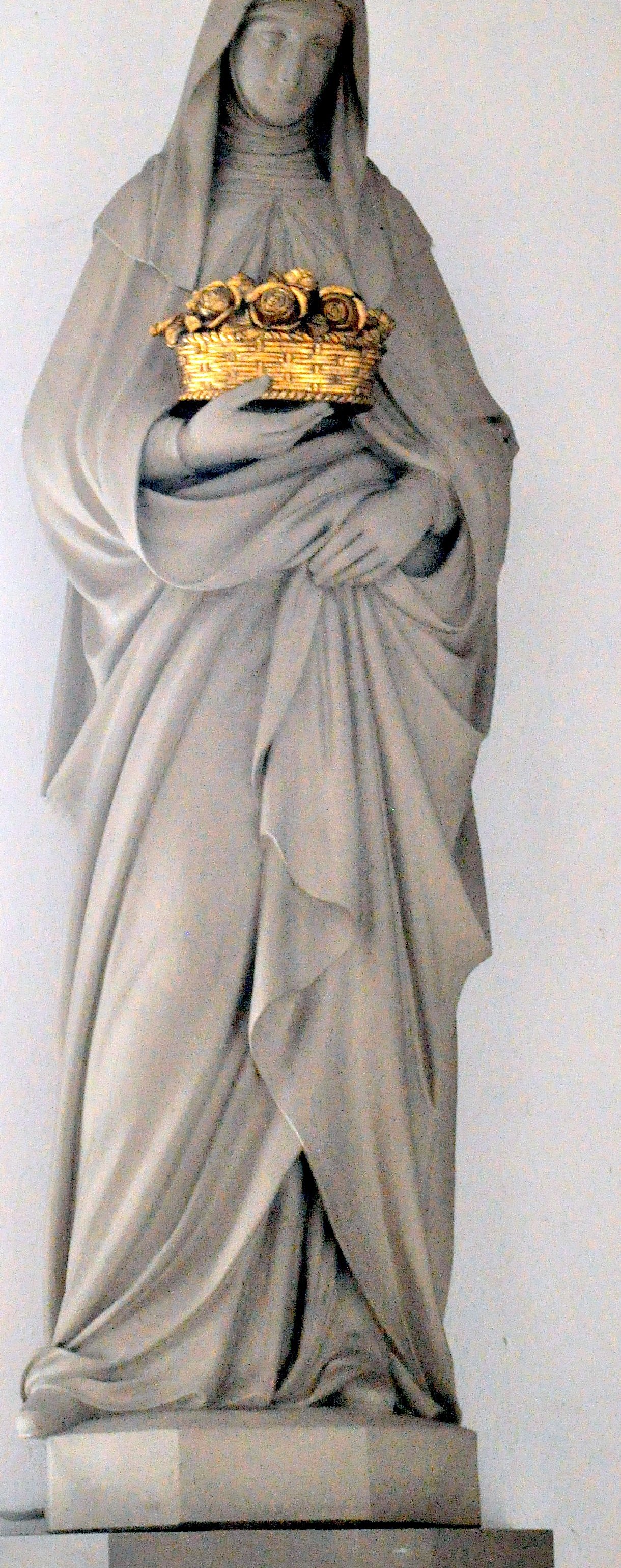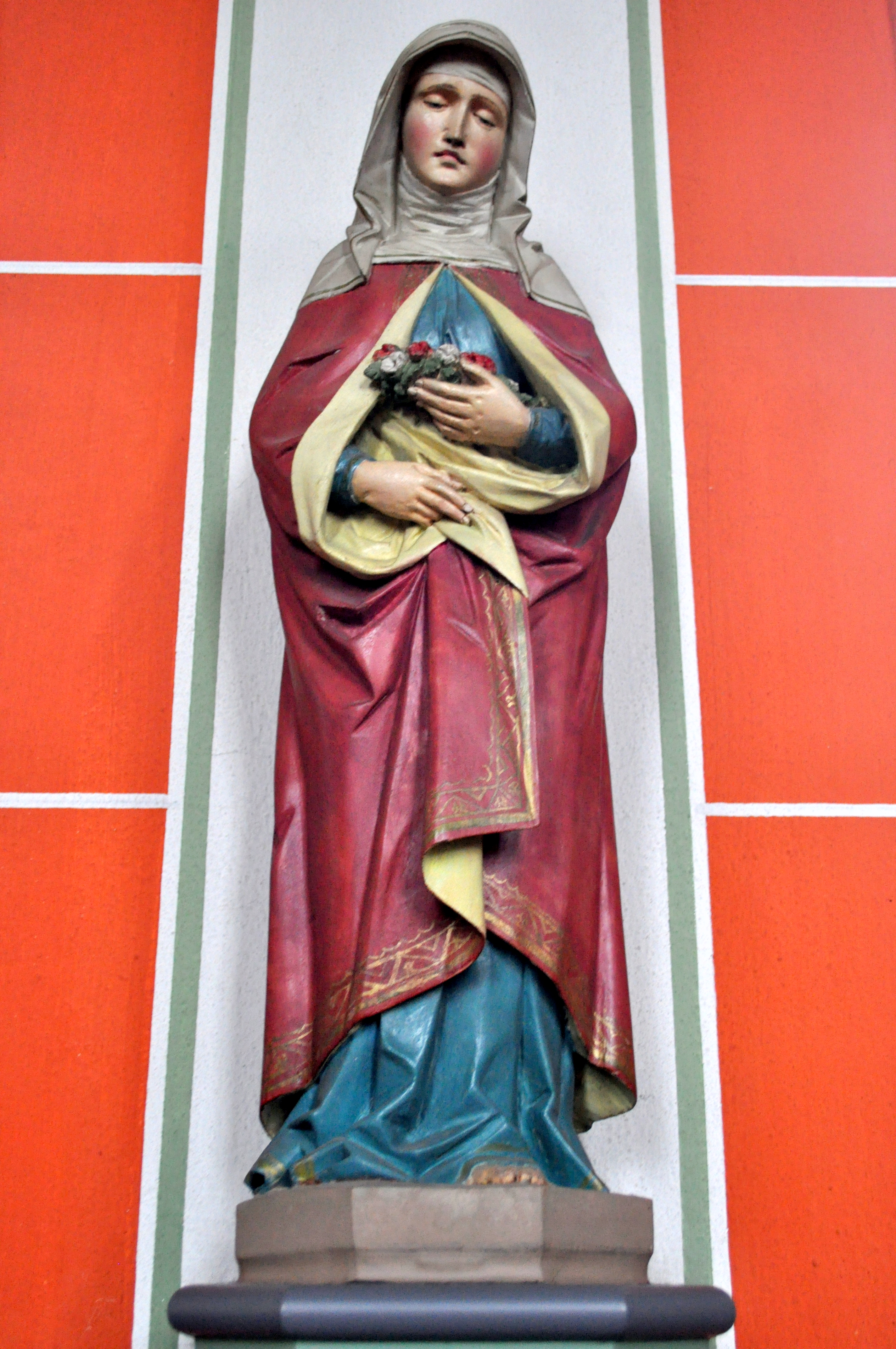 Interessant ist es nun zu wissen, ob sich das Gemälde von Franz Ittenbach auch in der Skulptur niedergeschlagen hat, denn Skulpturen gehen oft auf Druckvorlagen oder Gemälde zurück. Und tatsächlich gibt es mehrere Skulpturen, die dem Gemälde von Franz Ittenbach in ihrer Form folgen. Im Bistum Limburg ist es eine kleine, ziemlich unscheinbare Figur in der katholischen Kirche St. Laurentius in Thalheim (Hessen) im Hadamarer Land. An einem Pfeiler steht eine kleine Figur der Hl. Elisabeth, die vom Gemälde von Ittenbach beeinflusst ist. Die Skulptur des Hl. Franziskus in derselben Kirche folgt ebenfalls dem Gemälde des Heiligen in der Spitalkirche in Düsseldorf.