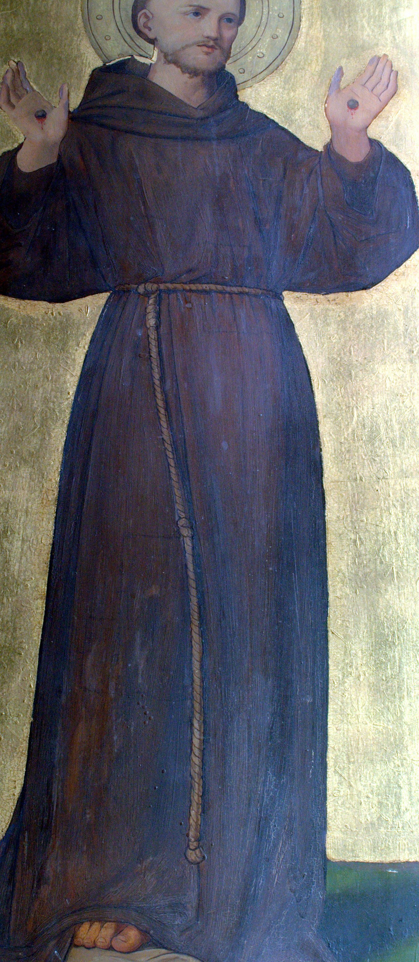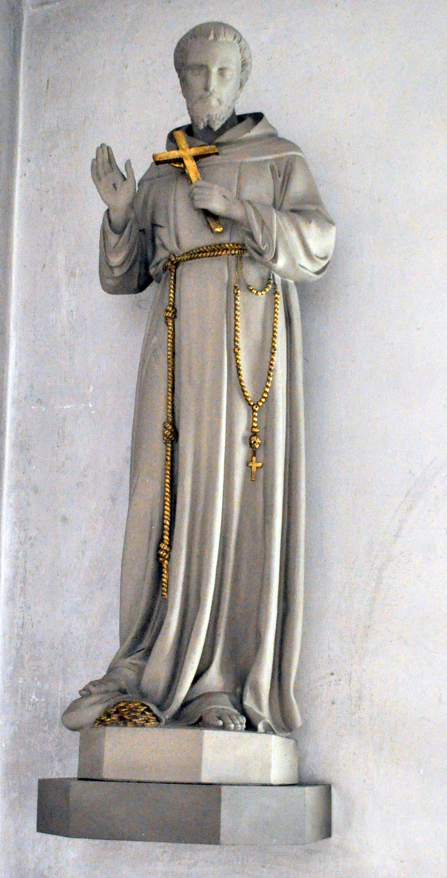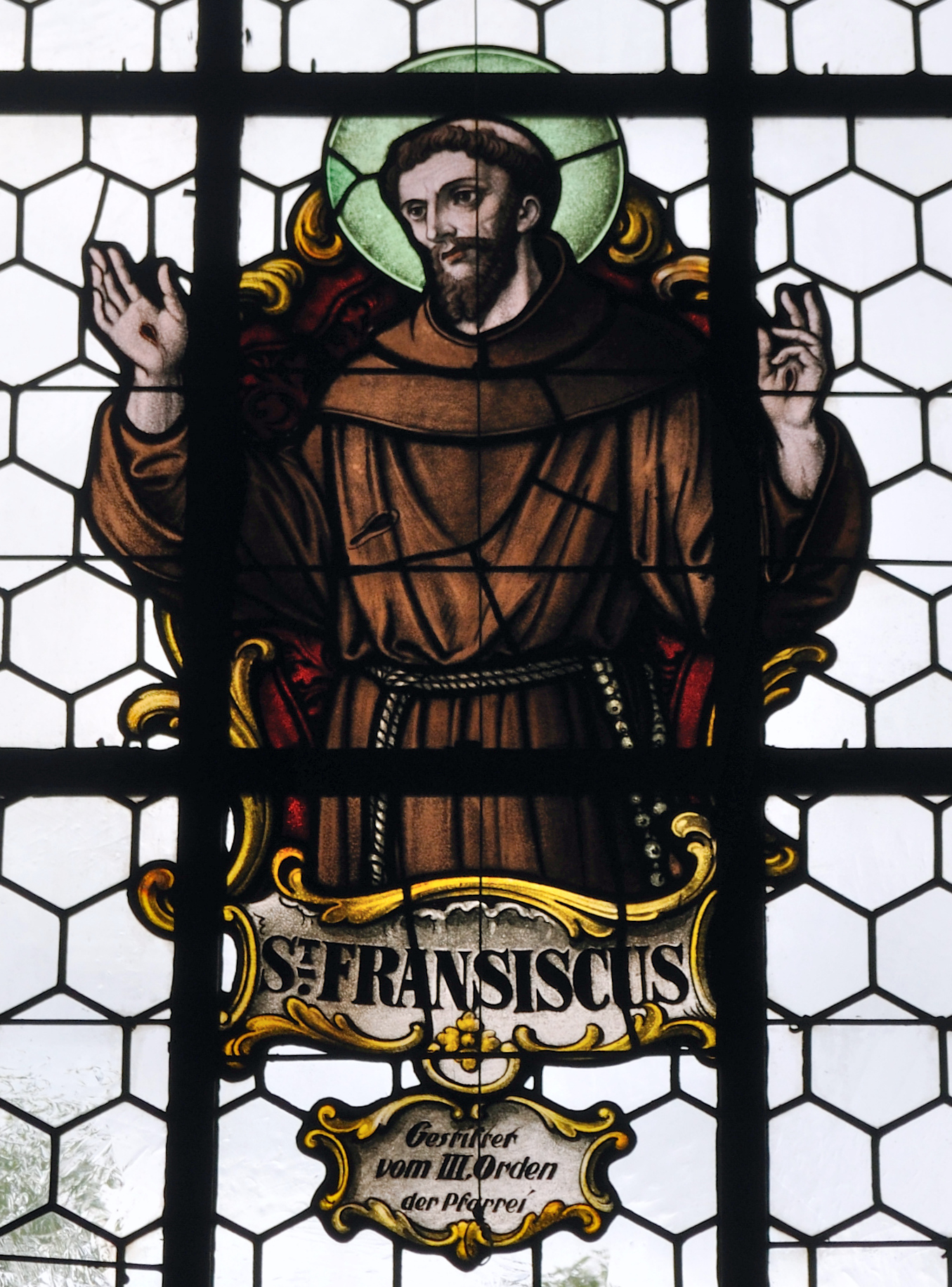 Auf der Gegenseite befindet sich der Gründer des Franziskanerordens, der Hl. Franziskus von Assisi (1181/82-1226). Den Blick hat er gen Himmel erhoben und streckt beide stigmatisierte Hände zum Gebet aus. Der Hl. Franziskus gilt als einer der ersten Heiligen, die als Zeichen der Verbundenheit mit Christus die Wundmale des Herrn empfinden durften. Mit dem nackten Fuß tritt Franziskus auf einen Sack voll Gold. Der Verzicht auf sein familiäres Erbe und auf weltliche Anerkennung führte Franziskus auf den Weg der Nachfolge Christi und zur Gründung des Franziskanerordens. Er ist der geistige Vater Elisabeths. Er trägt den rauen braunen Franziskanerhabit, die charakteristische Tonsur und um die Hüfte den einfachen Strick mit dreifachem Franziskanerknoten (3 Ordensgelübde der Keuschheit, des Gehorsams und der Armut). Elisabeth trägt diesen dreifachen Knoten als Franziskaner-Terziarin nicht.